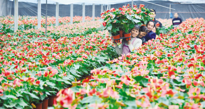 在温室栽培区,放眼望去,一片喜庆的红色,有红掌、情迷等花种。据了解,富豪公司花卉种植面积50亩,目前栽培了五六万盆红掌、情迷等多个品种年宵花卉,其中部分品种已成熟销售,个别品种预计将在元旦以后陆续上市。