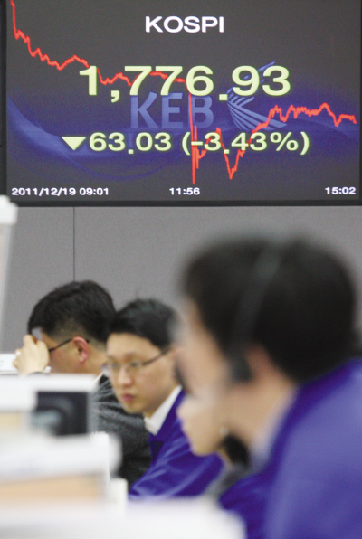 当天,韩国股市开盘下跌,首尔股市综合指数开低0.57%,在金正日逝世消息传出后,跌幅迅速拉大,外国投资者抛售规模达2065亿韩元(约合1.76亿美元)。
