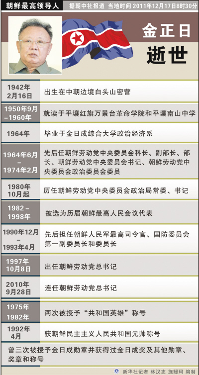 据朝中社19日报道,朝鲜最高领导人金正日17日逝世,享年69岁。