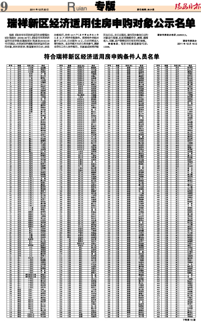 瑞祥新区经济适用住房申购对象公示名单