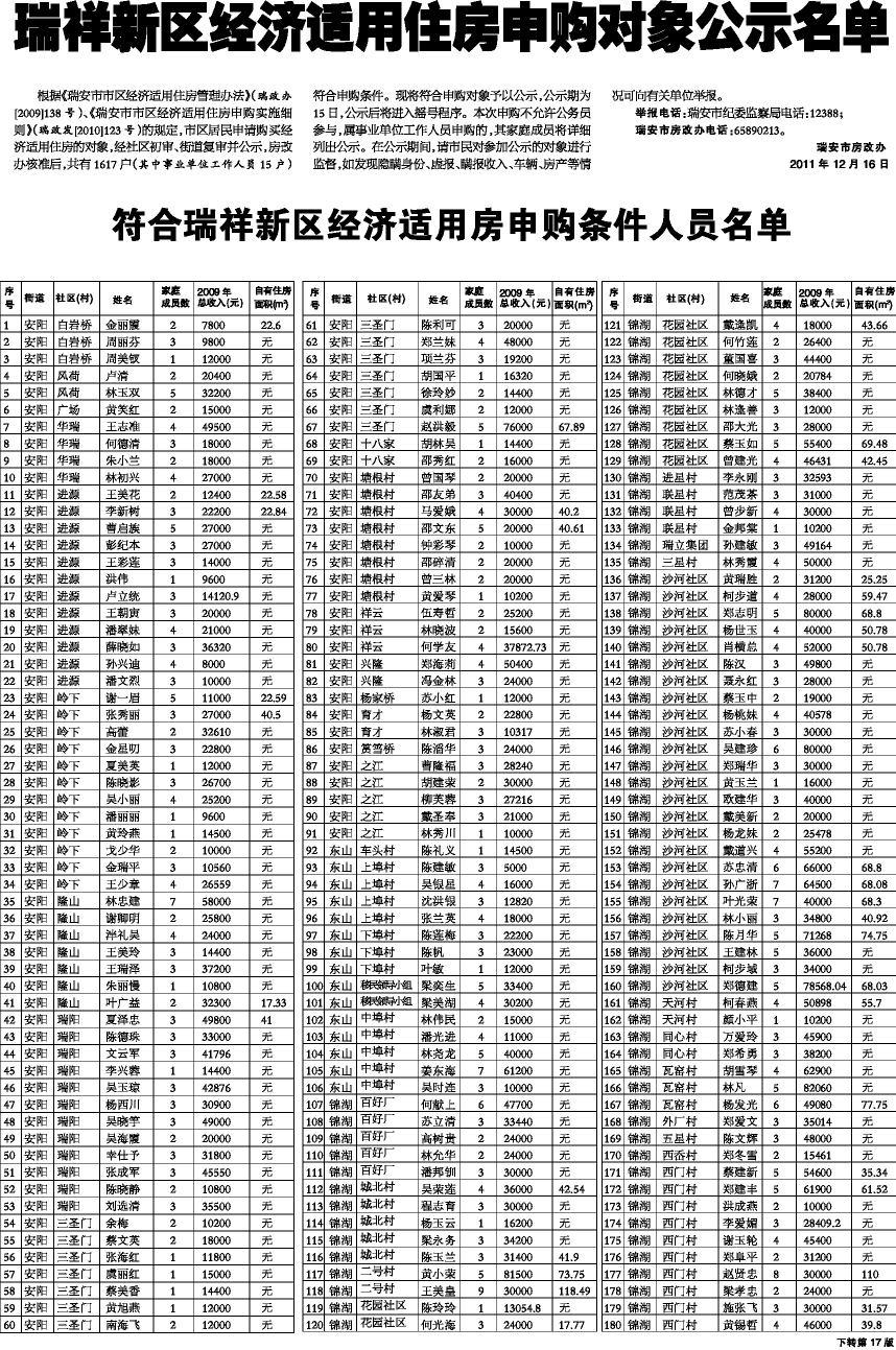 瑞祥新区经济适用住房申购对象公示名单