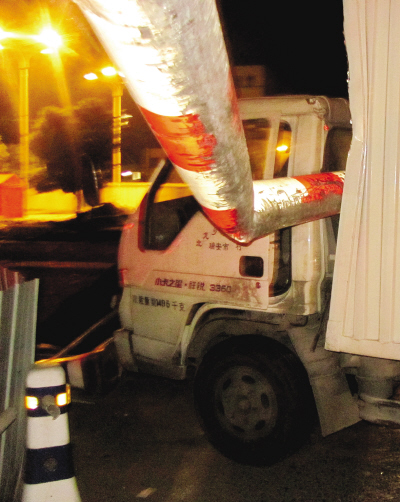 12月25日凌晨2时左右,瑞祥大道往瑞光大道东山方向的十字路口外,一辆“身高”2.8米的大货车撞断了限高杆,车头撞倒了旁边因修路设置的防护栏,险些掉进大坑。而限高2.5米的限高杆,被撞断了一大截,直径约30厘米的限高杆杵在了大货车车头和车厢的连接处,将驾驶室的车顶和车厢的前部撞得变了形,货车被卡住进退不得。