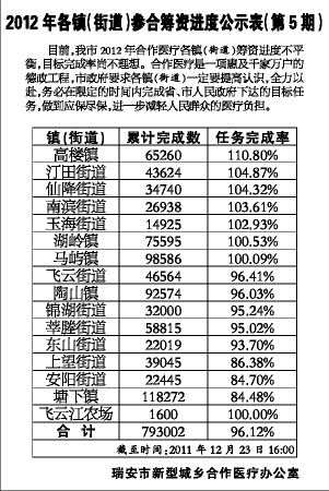 2012年各镇(街道)参合筹资进度公示表(第5期)