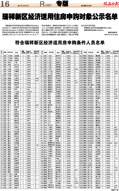 瑞祥新区经济适用住房申购对象公示名单
