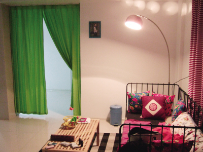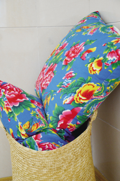 主卧里大红的窗帘,沙发床上红底、蓝底的牡丹土布靠垫,软隔断的翠绿布帘,桃红的折叠椅、粉色蓝色绿色的垃圾桶——这个家的用色是怎么大胆就怎么来,在一般家庭“避之唯恐不及”的艳俗色彩,在这里接洽得居然那么的和谐、悦人。