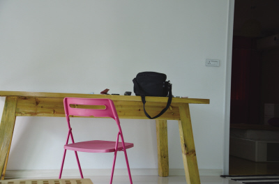 自己设计的大书桌:不需要很现代的款式,但一定够大,可以兼顾写作画画、喝功夫茶、工作等功能——寻遍所有家具店都找不到这样一张理想中的桌子的时候,嫒嫒又充分发挥了她的设计天分,自己画了设计图,找木料厂用最简单的木材定制了这样的一张桌子,没有做任何处理,只涂刷了三层清漆,整桌长2米,宽0.8米,总共才花了500元。配上木料厂给汽配工厂做的高脚凳,非常和谐,非常文艺。但现在遗憾的是,因为桌面桌脚的尺寸偏大,暂时进不了书房,搁置在客厅。