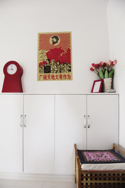 玄关处,处处有“玄机”:玄关布置得很“混搭”,重点是它处处含有“玄机”。“广阔天地,大有作为”的毛主席语录,直面大门进口处,一语双关,既指向空间的延伸,又表达屋主的美好愿望。大红的宜家闹钟,象征着红红火火的日子。