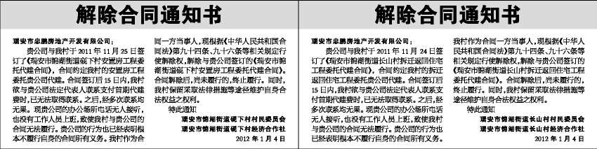 贵公司与我村于2011年 11月25 日签订了《瑞安市锦湖街道砚下村安置房工程委托代建合同》,合同约定我村的安置房工程委托贵公司代建。合同签订后15日内,我村欲与贵公司法定代表人联系支付首期代建费时,已无法取得联系。之后,经多次联系均无果。现贵公司的办公场所电话无人接听,也没有工作人员上班,致使我村与贵公司的合同无法履行。贵公司的行为也已经表明根本不履行自身的合同所有义务。我村作为合同一方当事人,现根据《中华人民共和国合同法》第九十四条、九十六条等相关规定行使解除权,解除与贵公司签订的《瑞安市锦湖街道砚下村安置房工程委托代建合同》。合同解除后,尚未履行的,终止履行。同时,我村保留采取法律措施等途径维护自身合法权益之权利。