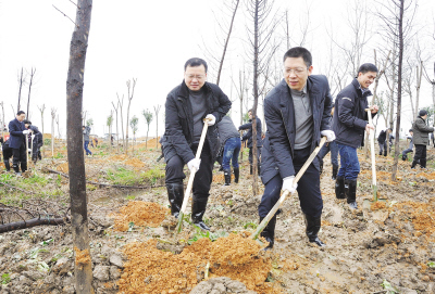 上午9时15分许,踩着泥泞,市领导纷纷拿起铁锹投入植树中,他们扶苗、铲土、培土……动作娴熟自然,干得不亦乐乎。市委书记陈建明拿起铁锹,用力铲土,细细培土,同大家一起合力种下一棵棵树苗。“新春植树,播种希望。今天我们大家都努力一下,为瑞安多添一片绿。”陈建明边种树,边询问有关情况,并要求全市上下全面掀起植绿造绿高潮,希望通过大家持之以恒的努力,把瑞安打造成为山水秀美、绿树成荫、空气清新、景色怡人的生态之城。