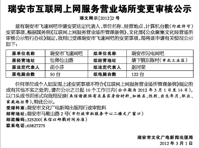 兹有瑞安市飞速网吧申请变更法定代表人、单位名称、经营地点、计算机台数(行政许可)变更事项,根据国务院《互联网上网服务营业场所管理条例》、文化部《公众聚集文化经营场所审核公示暂行办法》规定,我局已受理瑞安市飞速网吧的变更事项,现将该申请有关情况公示如下: