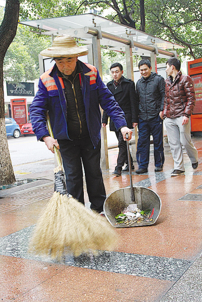 在虹桥路,记者见到了王文杰。他穿着环卫工作服,头上的鸭舌帽上又戴了一顶挡雨的大草帽。“我没有做什么特别的事,没有什么值得采访的。”他乐呵呵地笑着,说话带着浓重的安徽口音。