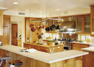 岛型厨房设计这些年出现了流行趋势。所谓“岛型厨房”,就是将本来“靠边站”的烹饪桌或料理台等堂而皇之地置于厨房的中央,将传统概念中不登大雅之堂的东西,从后台搬到前台。岛型厨房分为全岛型和半岛型两种,其主要功能是为全家人提供一个可以在厨房进行交流或者举行小型聚会的地方,让就餐变得其乐融融。在设置时,主人可依据房子的形状、大小以及主人的爱好来布局。将厨台独立为岛型,是一款新颖而别致的设计;在适当的地方增加了台面设计,灵活运用于早餐、烫衣服、插花、调酒等。
