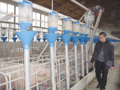 而在每张“定位床”前,都安装了自动给料机和传送管道,根据猪的“肥瘦”调整食量,让猪健康均衡发展。“仅喂食来讲,没上这套设备前,一个人最多负责四五十头猪的喂食,现在两个人就能负责2000多头。”