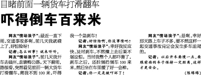 网友“情场浪子”:前几天我开车去温州,走塘梅公路。天下着雨,路很滑,突然看见前面一辆大货车打滑翻车,离我不到100米,吓得我一个急刹车!