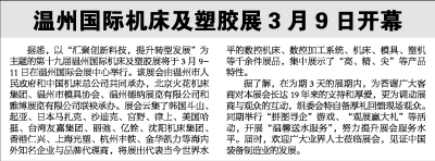 据悉,以“汇聚创新科技,提升转型发展”为主题的第十九届温州国际机床及塑胶展将于3月9-11日在温州国际会展中心举行。该展会由温州市人民政府和中国机床总公司共同承办,北京火花机床集团、温州市模具协会、温州德纳展览有限公司和雅博展览有限公司联袂承办。展会云集了韩国斗山、起亚、日本马扎克、沙迪克、宫野、津上、美国哈挺、台湾友嘉集团、丽弛、亿铨、沈阳机床集团、香港仁兴、上海光塑、杭州丰铁、金华凯力等海内外知名企业与品牌代理商,将展出代表当今世界水平的数控机床、数控加工系统、机床、模具、塑机等千余件展品,集中展示了“高、精、尖”等产品特性。