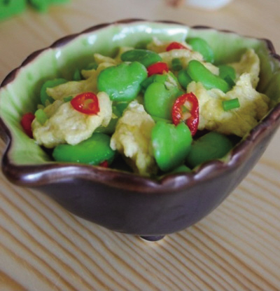主料:鲜豌豆150克、鸡蛋3个、小香葱1棵、小红椒1个