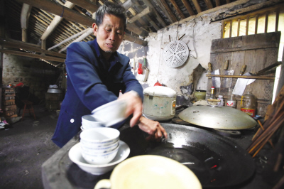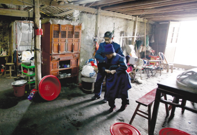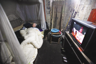 蔡金当家住山边两间石木结构的老房屋内,土灰的地面,老式的灶台,昏暗的灯光,破旧的橱子,老式木床发出吱吱响声。然而,家中却有两台新式电器——电饭锅和电视机。陪同我们一起来的村妇联主任胡美钗说,这电视是前年民政局送的。而现在的蔡金当生活费的来源和陈柳妹的医药费,只有每月220元的低保补助和陈柳妹每月110元的长寿补助。