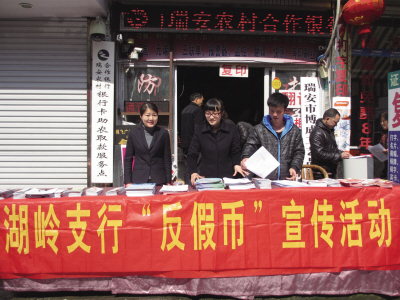 3月16日,该行在湖岭支行开展以“坚决抵制假币,自觉维护人民币信誉”为主题的反假币宣传活动,在助农取款点摆摊设点,拉开宣传横幅,发放宣传资料,通过真、假币实物对比,向群众讲解反假币知识。