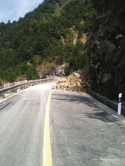 前晚20时,老57省道高楼镇张基岭村处山体塌方,滑落的山石堵住路面,造成车辆不能通行。昨日,高楼枫岭与文成县交界处又发现一处山体塌方,塌方下来的泥石占据了半幅路面。