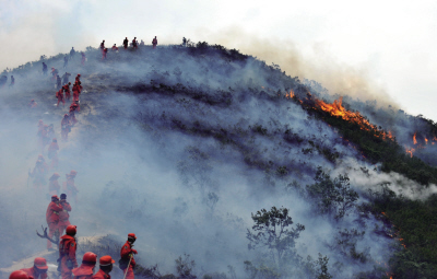 当日凌晨,云南安宁王家滩森林火灾火场出现复燃,距离附近的九渡村只有约400米左右。目前有数百名森林武警、消防官兵和解放军战士正在全力扑救,已经开辟了一条五公里长的防火隔离带,现场还有部分明火,但控制在隔离带外,火灾对村庄尚无直接影响。(新华社记者 蔺以光 摄)
