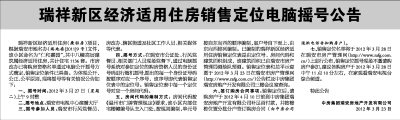 七、销售定位名单将于2012年3月28日在瑞安市房产管理网(http://www.rafg.com.cn/)上进行公布,销售定位摇号现场不邀请购房户参加,建议各购房户于2012年3月28日中午11点10分左右,在家观看瑞安电视台综合频道。