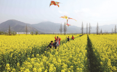 昨日,小孩们在马屿镇天井垟现代农业园区的油菜田里放飞风筝。马屿镇的6000多亩金黄色油菜花竞相盛开,景致迷人。