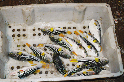 扁圆的体形,黄白色的肚腹,美丽的斑纹,鲜黄的鱼鳍……箩筐里一条条外观漂亮的鱼儿吸引不少人的眼球。“这不是河豚鱼嘛,有毒的!”人群里突然冒出声音。