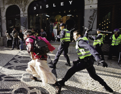 3月22日,在葡萄牙首都里斯本市中心,警察驱赶一名参加罢工的示威者。