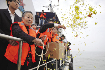 3月30日,80岁的陈美凤老人准备将逝去丈夫的骨灰盒放入大海。