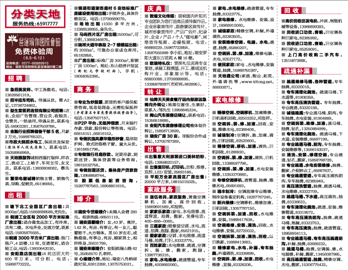■ 天地通公司:家政、物业、拓荒、外墙清洗等,www.tdtong.net,66600871。