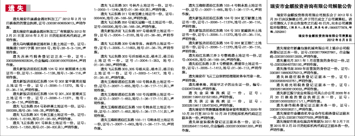 遗失瑞安市康盛金属材料加工厂2012年2月10日核准的的营业执照,证号:330381608050613,声明作废。