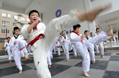 6月5日,莘塍中心实验小学举行“减负提质”专项改革10周年现场会。艺术欣赏、益智激情等5大类26个项目让同学们乐在其中。图为同学们在进行跆拳道表演。(记者 孙凛)