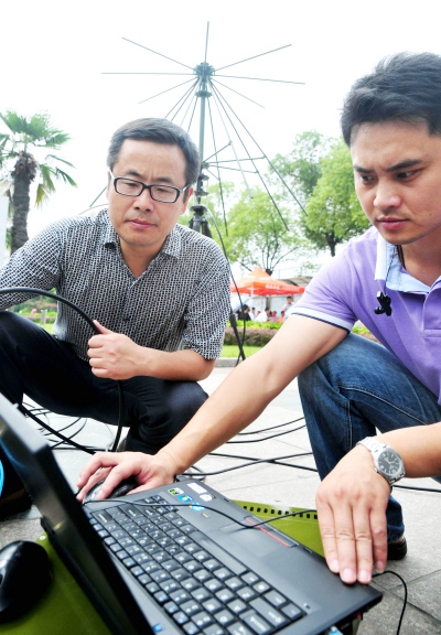 当天是2012年高考第一天,安徽芜湖无线电管理人员来到安徽师范大学附属中学考点架设“监测、测向和作弊信号压制器”,一旦发现可疑信号,将可以立即查到并进行追踪。