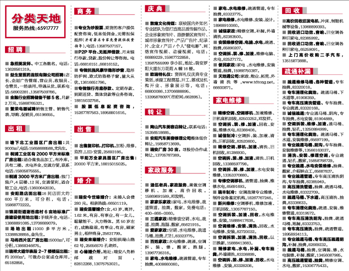 ■ 天地通公司:家政、物业、拓荒、外墙清洗等,www.tdtong.net,66600871。