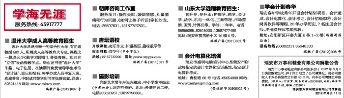 温州大学是温州唯一的综合性大学,有正副教授582人,所属成人高等教育大专班,课程比一般成大少《数学》等四门,普受青睐。现已在“立信”设函授教学点。毕业证书盖“温州大学”印鉴,电子注册。在读期间免费辅导学生考取“会计证”。即日起报名,将举办成人高考复习班。欢迎普高、中职或同等学历同学低费高复。详询:82521418 网站:www.ralxcx.com