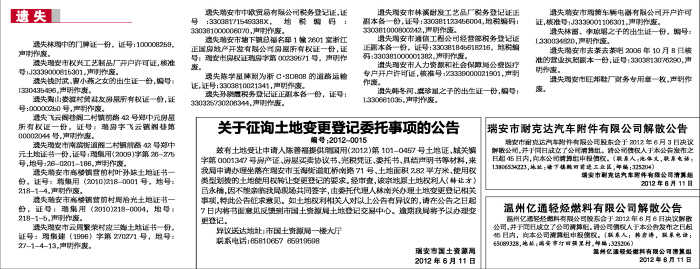 遗失瑞安市云周繁荣村应三娒土地证书一份,证号:瑞集建(1996)字第270271号,地号:27-1-4-13,声明作废。
