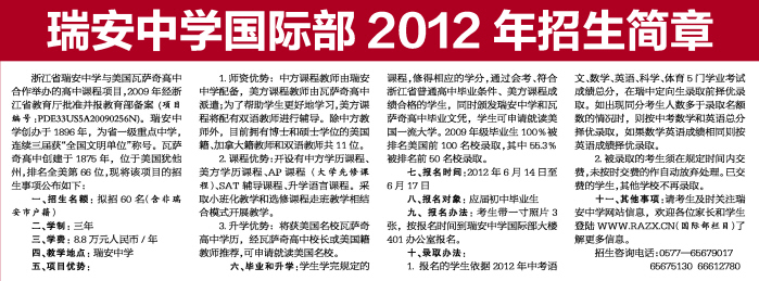 十一、其他事项:请考生及时关注瑞安中学网站信息,欢迎各位家长和学生登陆WWW.RAZX.CN(国际部栏目)了解更多信息。