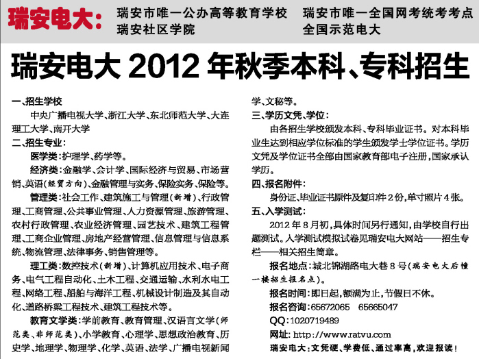 报名地点:城北锦湖路电大巷8号(瑞安电大后幢一楼招生报名点)。