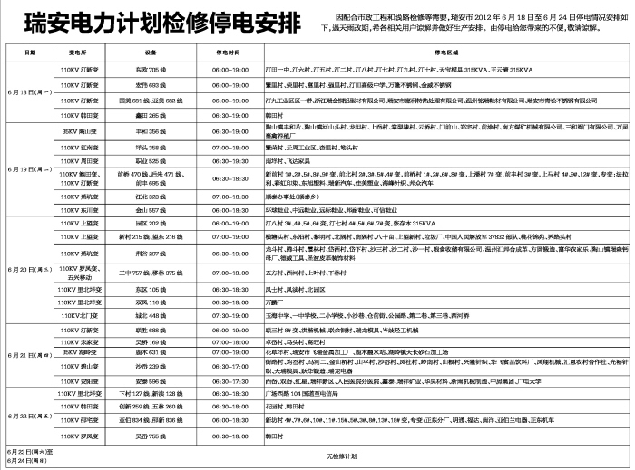 因配合市政工程和线路检修等需要,瑞安市2012年6月18日至6月24日停电情况安排如下,遇天雨改期,希各相关用户谅解并做好生产安排。由停电给您带来的不便,敬请谅解。