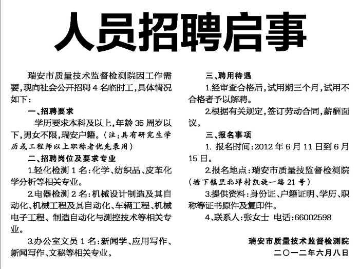 瑞安市质量技术监督检测院因工作需要,现向社会公开招聘4名临时工,具体情况如下: