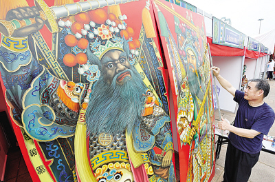 色彩艳丽、形状高大的“门神”,在现场所有非遗的项目中最显“霸气”。作者董志远刚刚放下手中描绘的笔,就有不少参观者纷纷要求与“门神”合影。“好美啊!”小学三年级学生慧慧告诉记者,这是她第一看到“门神”。