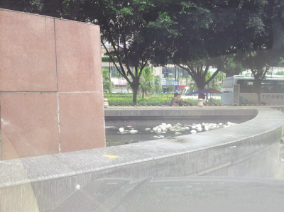 昨日,记者联系了@无业宅民。他说,前几天经过新商城门口时,发现水池里漂着一堆白色不明物体,走近一看,居然是白色泡沫饭盒。