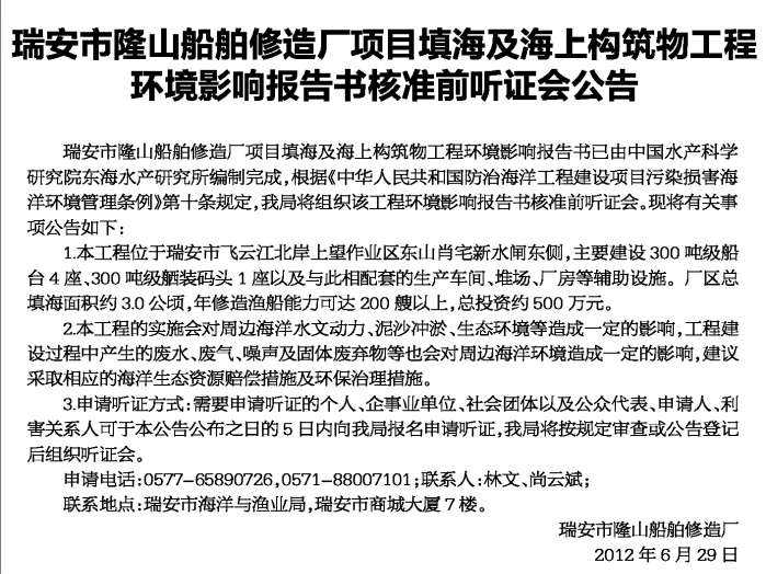 瑞安市隆山船舶修造厂项目填海及海上构筑物工程环境影响报告书已由中国水产科学研究院东海水产研究所编制完成,根据《中华人民共和国防治海洋工程建设项目污染损害海洋环境管理条例》第十条规定,我局将组织该工程环境影响报告书核准前听证会。现将有关事项公告如下: