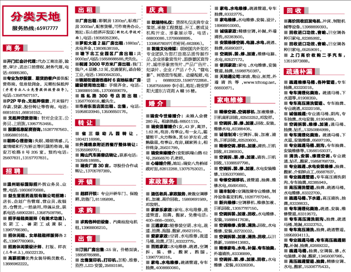 ■ 天地通公司:家政、物业、拓荒、外墙清洗等,www.tdtong.net,66600871。