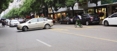 日前,记者在市区虹桥路看到,原本汽车各走各道,道路还算畅通,一辆出租车突然绕过马路中间的双黄线掉头,车身插入对向车道,占去一半的车道。结果,对向车道上的四五辆车立即被堵,引发了几分钟的小阻塞。