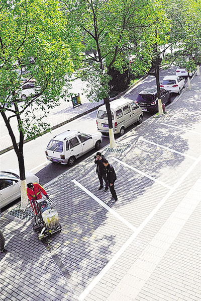 当天上午,执法人员首先在温州市区南浦路人行道上开始施划,这里共新添人行道停车位43个。在南浦路187号前的人行道上,记者看到,施工人员在青砖人行道上压下一条条白色油漆印(如下图)。一个小时后,油漆干硬,施划完成,施工人员继续前往望江路和新城大道,按照预定方案施划停车位。