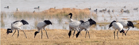 12月18日,一群黑颈鹤在大山包大海子湿地悠闲觅食。