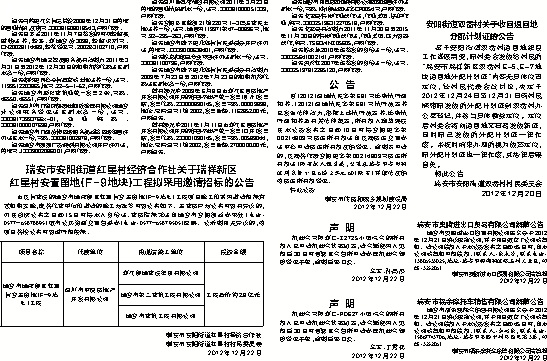 由我村建设的瑞安市瑞祥新区红星村安置留地(F-9地块)工程项目施工拟采用邀请招标方式组织实施,现将代建单位拟邀请的施工对象等内容公布如下。若建房户对公布内容有异议的,可在首次公布之日起15日内持本人身份证、建房指标凭证向瑞安市安阳街道办事处(电话:0577-65878895)或市公共资源交易管委办(电话:0577-65879505)反映。公示期间无异议的,该项目将按公布内容进行招投标。