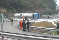 12月26日15时14分左右,金丽温高速永嘉县梅岙出口处的匝道上,一辆运输汽油的槽罐车行驶不慎发生侧翻,随后,汽油发生泄漏,情况十分危急。接到报警后,温州消防立即调集力量前往事故现场实施处置。