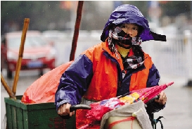 昨天上午10时许,天下着大雨,寒风凛冽让市民都不愿上街。56岁的环卫工人赵文之穿着雨衣,身后的三轮车里已装满垃圾。